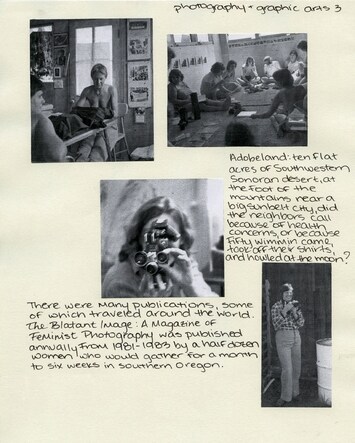 For the Lesbian Lands installation at the Columbus Museum of Art this year, however, Winant appeared to have diverged from her usual photomontage approach, in presenting two unlikely seeming objects. The first, a large wooden-framed structure, resembles that of a photo studio originally captured mid-construction by photographer Ruth Mountaingrove on one of the many lesbian lands she lived on in southern Oregon. The second item is a consciousness-raising rug – the kind on which womyn would sit, talk, share and engage in their collective experience. The wooden work is paved with a collage of the OWLT’s archive imagery: pictures of women building, taking photographs, learning instruments, riding motorbikes, gardening – often naked or topless. The radiant, silvery photographs are arranged and annotated with a free-form essay about the movement, detailing Winant’s awe, as she begs questions of this generation of pioneers. This time, having started with the found imagery, the artist worked outwards, constructing a three-dimensional space.