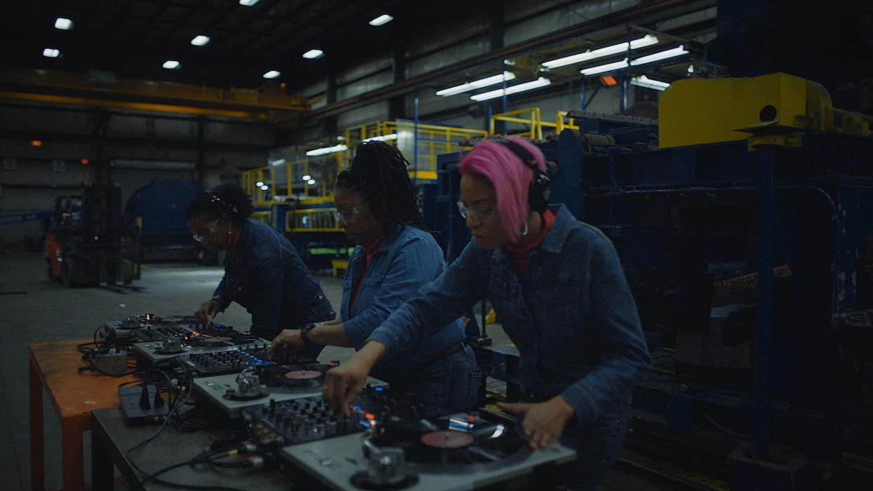 She shows this by filming three generations of legendary female techno DJs – Stacey Hotwaxx, Minx, and DJ Holographic – playing records side by side in an automobile factory, while assembly-line workers build cars behind them.