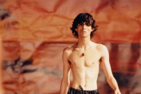 He appears in Black Palms, Simons’ Spring/Summer 1998 collection, and the stars, alas, are painted. Franky Claeys, the artist behind the collection’s graphics, flagged Apocalypse Now as an influence for the show’s torched aesthetic, but to me, its red-and-black palette recalls the 1981 USA print of Christiane F’s autobiography (which Simons has since paid direct homage to). For the show, Simons rented out this enormous echoing vault of a garage in the Bastille quarter of Paris and assembled a gang of beautiful young men to model his clothes – men, not models. They were mostly skaters, raver types Simons found through ads circulated on the radio, and the looks were dark, gothic, undone, in some cases literally bare, bones flashing beneath flimsy shirts unbuttoned and blowing wide open. Down the ramp they come: skulking, scowling, pale and scrawny, their movements slow and eyelids heavy as if still shrugging off last night’s lazy sex. Some of them are topless with billowing floor length pants tied loosely at their waists, some of them look shaken, half-sleep as though rudely startled from their coffins. Floss-thin bodies hewn close to the bone, pointy rib-cages in place of washboard abs, hair slicked back or falling forward in shining greasy locks: this was the brooding, vampiric correlate to the ‘sexed-out Studio 54 lotharios’ audiences were used to.