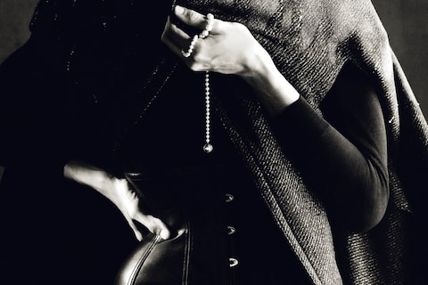 Mamour is wearing an Ulster coat in a milletrage composed of black satin lining, white triple organza, white felt, anthracite chevron-printed wool crêpe and an aquarelled tulle voilette with a moon-faded print, worn with a black wool polo neck, the memory of a trouser in a milletrage composed of black silk lining, white double organza, white felt and brown tweed texture-printed wool crêpe worn over black silk organza pyjama trousers cut into shorts, windowpane-printed emotional-cut wool crêpe cap and black and green jacquard socks MAISON MARGIELA ARTISANAL DESIGNED 2024 BY JOHN GALLIANO. Black croc-embossed leather Tabi lace-up brogue boots CHRISTIAN LOUBOUTIN FOR MAISON MARGIELA