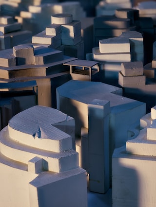 Demand’s Model Studies, however, appear to depart from this, his usual practice. Turning his lens on architects’ models, rather than his own, he investigates the space between conception and realisation. These abstract and textural series zoom in on often discarded and disregarded models – miniature imaginings of building designs that bear the marks of craft, hope, indecision and exploration. In fact, three-dimensional space has always framed Demand’s vision: he studied sculpture, not photography, under professor Fritz Schwegler, alongside Katharina Fritsch, Thomas Schütte and Gregor Schneider. His works have been girdled by architecture – by construction – ever since.