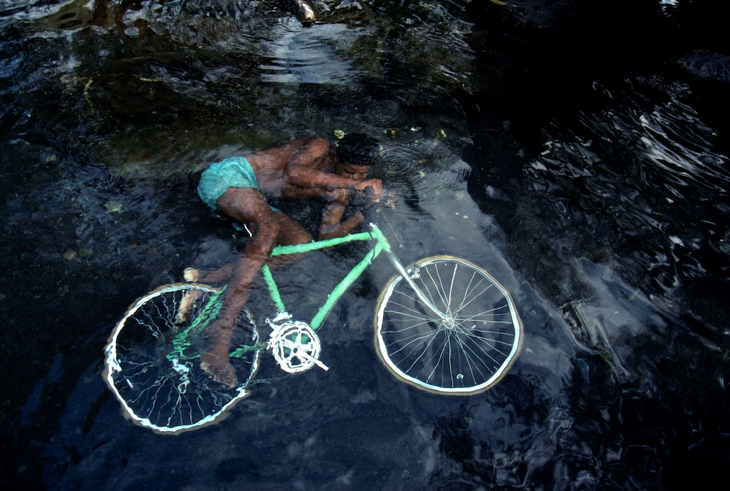A rippling, slightly distorted image seen through the clear water of a river on the French island of Réunion shows a boy cleaning his bicycle. Taken by French photographer Bruno Barbey in 1991, the shot is a fleeting, surreal study of youth and nature. “When travelling and photographing, you have to establish human contact while remaining discreet. Luck sometimes plays a role too,” the photographer says. “This boy was cleaning his bicycle in a spring and playing with it; my luck was that he wore green shorts matching the colour of his bike. Photography is the only language that can be understood anywhere in the world.”