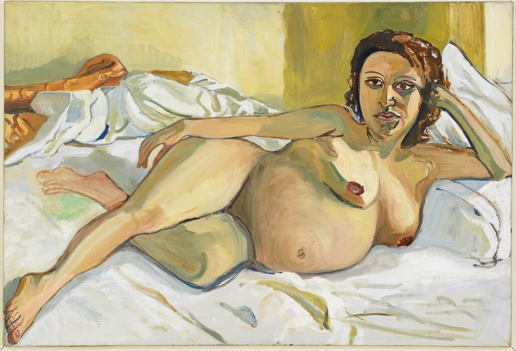 Pregnant Maria, 1964, is the first in a series of pregnant nudes she began the same year. Maria is thought to be a neighbour (Neel often painted neighbours, from Greenwich Village to Spanish Harlem). In the series, Neel exposes the physical pressures and emotional labour of motherhood while radically expanding the depths of female subjectivity as seen in art at the time. These mothers were not sanitised or Madonna-like but visceral and vulnerable.