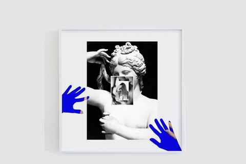 “This is one of my favourite discoveries. She’s Spanish, living in the USA. She stopped ‘taking’ photographs ten years ago as a reaction against photography; now she uses archives. The big images at the back are from the Warburg Institute in London. Warburg was one of the first curators to catalogue objects from history of art and antiquities using thousands of photographs of ancient things. The middle images are from the post-war archive of Harry Shunk and János Kender – two photographers who documented lots of performance and conceptual art in the 60s, 70s and 80s. The small images on top are found on the internet. When you put them altogether, it’s like you’re compressing and layering time and space in one image. The blue is her hands inserting herself into the work.