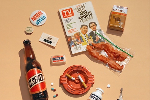 NLC: I really, really love everyday objects and nosing around charity shops and flea markets. On one of these visits I came across a ceramic loo roll holder that had “Toilet Roll” written on top in swirly writing. I thought this obviously once belonged to someone like Julie; I bought it immediately and so it began. I’d think “oh yes that ‘South Wexford Ordnance Survey Map’ was absolutely Terry’s, he probably went there on business. Before I knew it I had accumulated lots of treasures such as a miniature puzzle of the Queen Mother and a 1991 air freshener called “Fresh Hell”. Every object I found could relate back to one of the name tags and this began building the person until I just knew what they looked like. I would describe this to the wig designer, prosthetics artist, stylist, make-up artist and nail artist, and together we worked to make them come to life. It was really important that they looked like real people, so we would have conversations about whether they had a perm, rosacea or bitten fingernails to make sure there was attention paid to the smaller details. It was a very close family atmosphere on set, there weren't very many of us – I was usually in the make-up chair with Malina (SFX make-up) for hours for the more complex characters, so Britt (the prop stylist) would have loads of time with the objects to arrange the still life. When I was finally ready we would all perk up and I’d get a burst of energy and do a little dance.