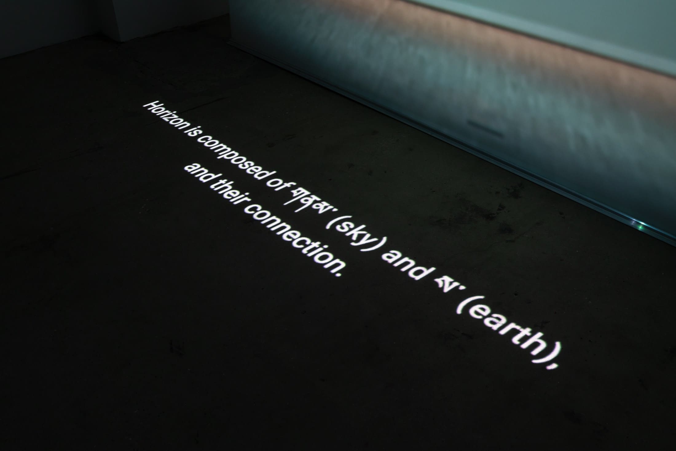 SX: Theatre has been a reoccurring language in my practice, as it makes obvious the intentionality of performativity. At the same time it describes the distance between representation and reality. The separation of text from image in the installation references a long-held interest in the capacity of text and images working together, contrary to focusing on their differences and incompatibility. The installation separates the text from the image in the way that they are intentionally dependent on each other, being the reference of context. The audio is in Mandarin and Tibetan, it can be heard on both sides of the screen that’s positioned in the middle, separating the space into two parts. The English subtitles are projected on the floor on the rear side of the projected image, which for me personally alludes to the ‘backstage’. The Tibetan subtitle is not of an explanatory nature, it accompanies the image’s front side as if they were paintings shifting in time.