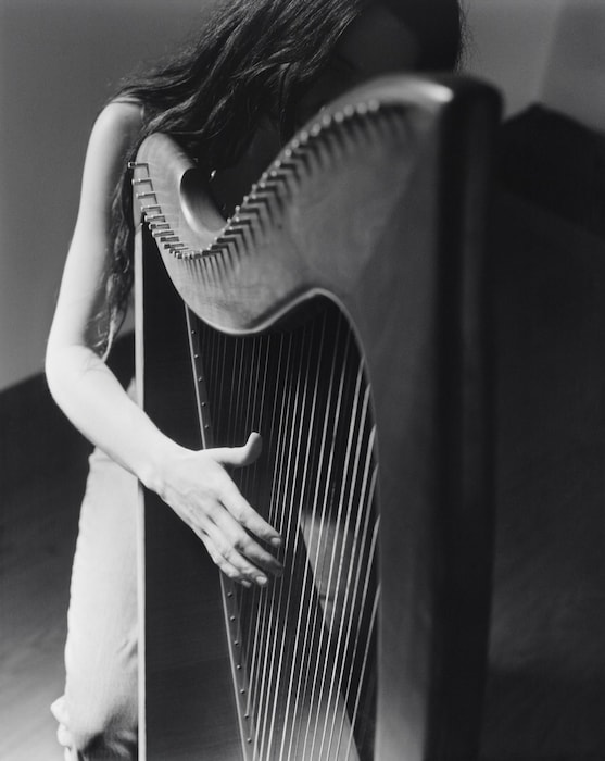 Starting out as a model in Ukraine – where she had to return from Paris to be with family amid the conflict – Uronich’s self-taught approach to dance is also totally organic. “She’s like an autodidact,” says the photographer. “She’s got so much energy and she’s so positive, even during everything happening in her country. The energy she brings is very free. It was really nice to work with her.” Amazingly, the harpist and dancer not only met for the first time at the launch event for Dissonance in Paris last year, but they also didn’t know their portraits were being intertwined in the exhibition until they arrived that evening. “They were really touched,” says Simond of the surprise reveal.