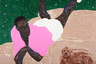 A booth from London-based Sadie Coles HQ packs a punch with its dedication to ecstatic art from Britain and beyond. Fresh off the back of Sarah Lucas’s major exhibition at the Tate Britain, Happy Gas, the gallery presents two Tit Tom sculptures made from models of stuffed tights, their construction suggestive of drooping breasts. With more sculpture, the gallery is debuting a new work from the latest artist to join their roster, Tau Lewis, whose 2024 work Lilith, crafted from leather, shearling and beads, finds its roots in the African diasporic experience. Elsewhere are playful embroidered works by Borna Sammak, whimsical portraits by Paloma Varga Weisz, a multi-material painting by Alvaro Barrington, and a (totally bonkers) zoophilic bronze sculpture by Urs Fischer.