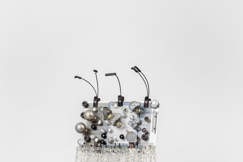 Minimal in its installation, Rose Easton’s new group exhibition Vampire-Junkie has a preoccupation with sound and absence. The show brings together the work of four emerging artists: Hampus Hoh’s large transparent sculpture, featuring discards of musical instruments, Scott Keightley’s Y2K tech glam music standing adorned with glass orbs, Callum Jones’ haunting image of a crowd transformed via mechanical means, and Samuel Guerrero’s painting of a stadium void. The feeling that reverberates between the works is a sense of the uncanny, and the shadow of events which are yet to take place. The exhibition is accompanied by a programme of live events and activations; there will be an evening of listening with Callum Jones on April 11 at 7pm.