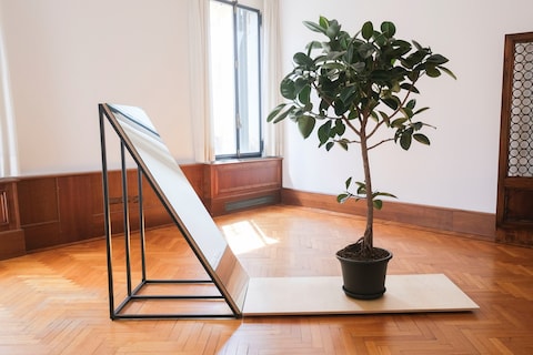 A garden is growing in the elegant interior of Palazzo Franchetti – a particularly opulent Venetian edifice on the city’s Grand Canal. At the top of the building’s palatial marble and stone staircase, with its series of imposing gothic windows overlooking Ponte dell’Accademia, the entire upper floor is lush with vegetation. Each adjoining room is dominated by garden beds hosting a diverse range of plants, herbs, and flowers from lemon trees to monstera, strelitziaceae and pineapple plants. In contrast to the ornate and perfectly symmetrical pattern of flora and fauna painted on the building’s baroque vaulted ceiling above the central staircase, the real plants and flowers growing on the top floor of the palace are not there simply to decorate the space – they are claiming space.