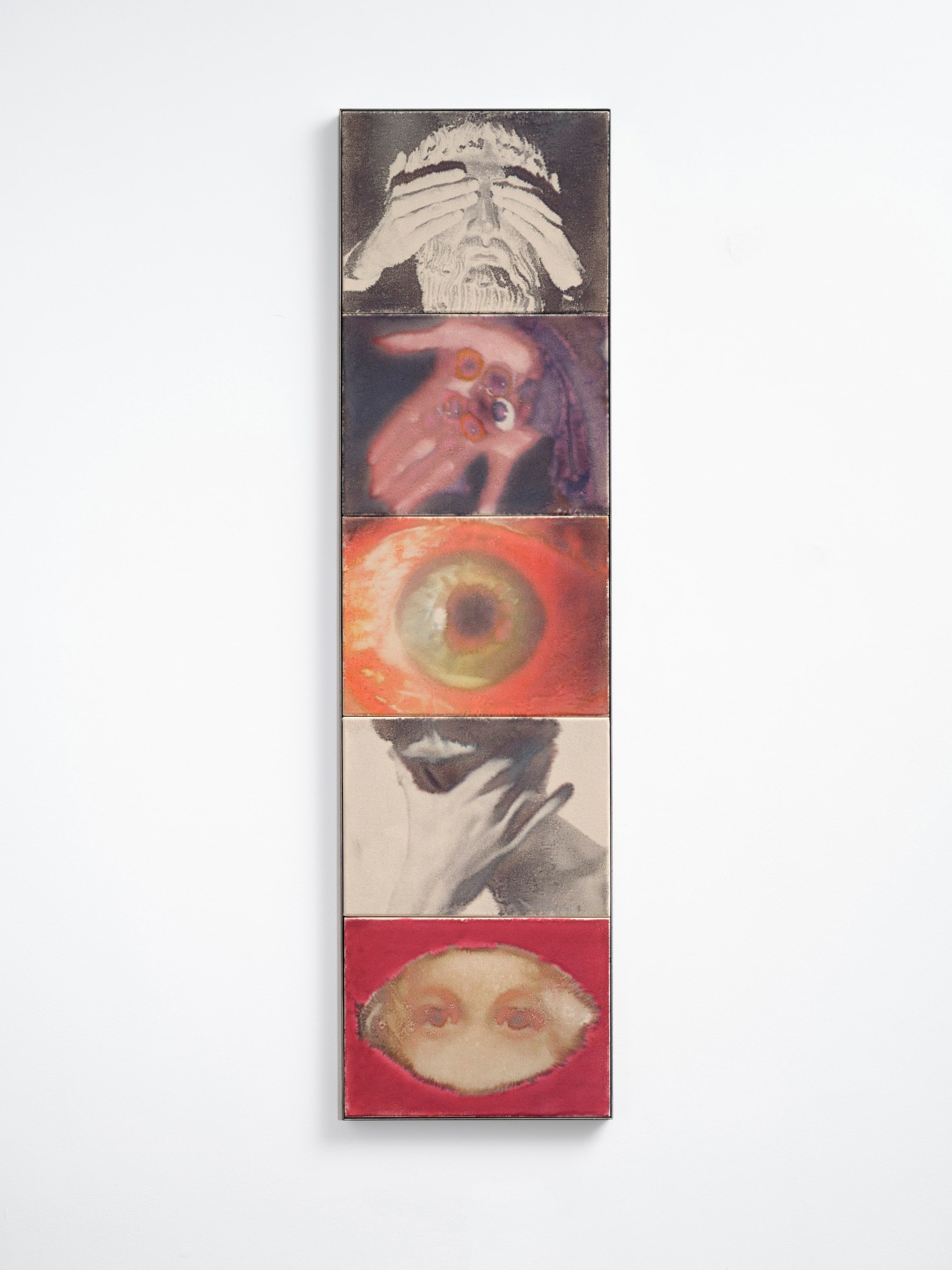For this exhibition, Kim continues to slowly reveal more of himself. He uses eyes as a “sort of protest,” explaining they are at the core of the discrimination he experienced. From his tightly cropped and gestural self-portraits to pigment transfers of found imagery, each work gazes not only at each other but at the viewer too, inviting them to “confront their own experience” and therefore question their own subjectification in an exchange between the observer and the observed.