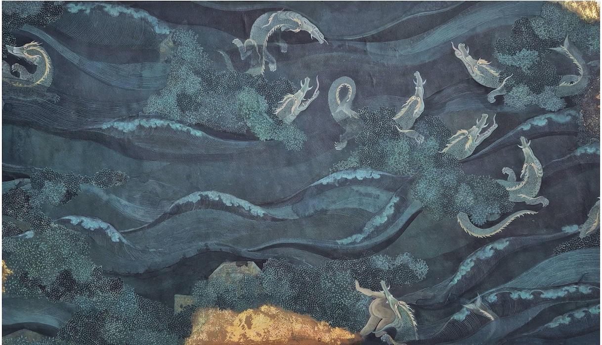 Last year, Anindita Bhattacharya took up position as the Frere Hall artist-in-residence at Oxford’s Ashmolean museum, the first Indian artist to do so. And standing before her sprawling multi-panelled painting at Gallery Threshold’s stand, it’s evident that further recognition awaits. Bhattacharya’s extraordinarily intricate fine-brush painting style deliberately recalls “a language forged in the imperial Mughal courts of Delhi, Agra”, but her references extend much further, from medieval Gothic gargoyles to the Turkish monsters of Siyeh. While traditional techniques and storytelling inform her practice, however, the themes she explores are unerringly relevant. This piece depicts a swirling body of water, which, upon further scrutiny, is found to contain “monstrous forms and crocodilian figures” – one of whom is consuming a nude human figure whole. The discreet inclusion of these carnivorous creatures symbolises “nature’s relentless cycles of life and decay”, not always visible but ever-present.