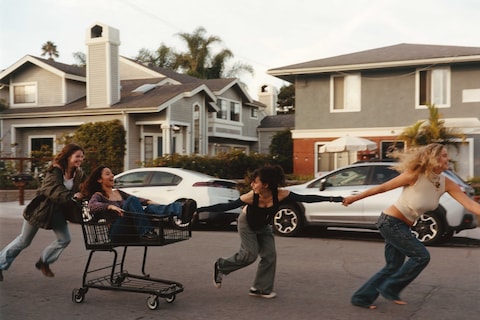 What emerges is a kind of environmental portrait, but also an emotional one. Three friends, barefoot, half-dressed, and unhurried, bask in the late-afternoon sun. Two boys lock into a sunlit wrestle by the ocean against a backdrop of fading light. A girl swings from the rafters of a cluttered garage as her friend reaches up towards her. The images feel undeniably youthful: alive with sweat, chaos, and closeness.