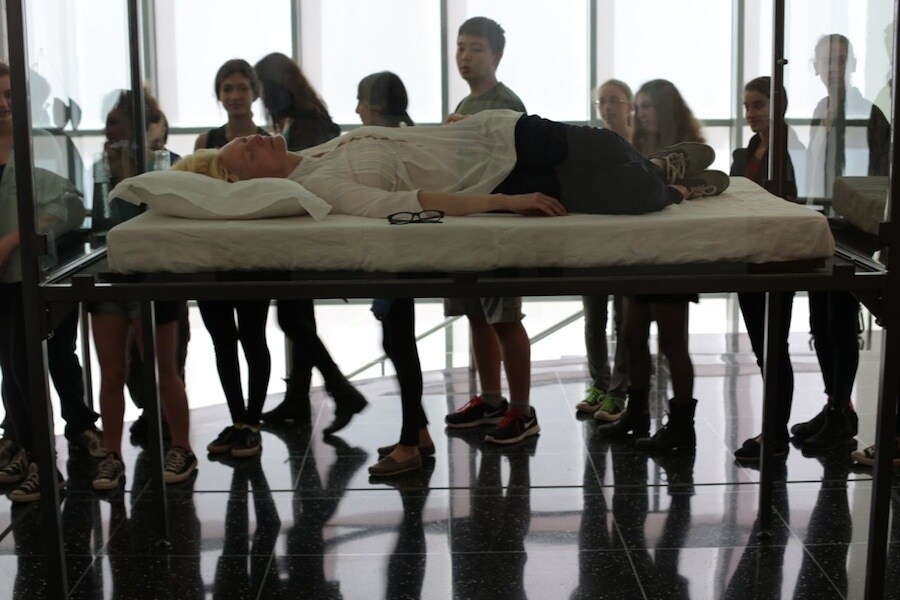 Much has changed since 1995, including Swinton’s public profile; her fame now as much a material of the piece as the metal and glass that surrounds her. The speed and dissemination of imagery and commentary across social media and the phenomenology of "trending" mean that a lot more people are having a secondhand, mediated experience of the performance – a performance that is built around the notion of the modesty of shared – unmediated – living presence. Whether this re-performance is happening despite today's permeation of social media, because of it or as a critique of it remains an open question. A never-ending maybe.