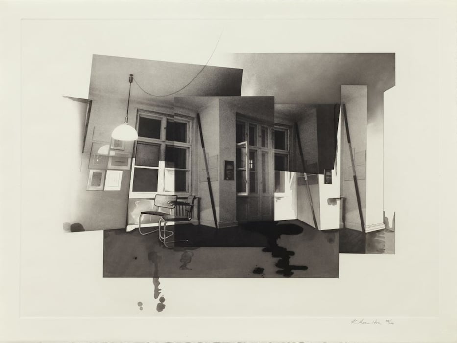2. Hamilton was highly skilled. Despite having a rocky relationship with art institutions – he left school without any formal qualifications and was expelled from the Royal Academy – he was a highly skilled draughtsman and had a firm understanding of his own approach. During a 1971 talk at the Palais des Beaux-Arts in Brussels he said, “I find that everything I do is concerned with one of four means of representation…The first way is probably pure figuration, pure photographic rendering… Then I find that there’s a geometrical approach. So that perspective is sometimes elaborated in a very precise way. Then there are occasions when I remember that the medium of paint is important. American Abstract Expressionism was concerned almost entirely with that plastic quality of paint. So I put paint in a very direct way onto a photograph or onto a drawing… I think that signs [also] appear sometimes in my work. So some of [my]