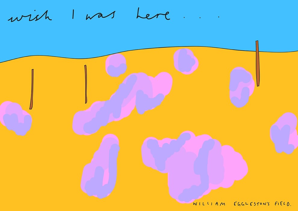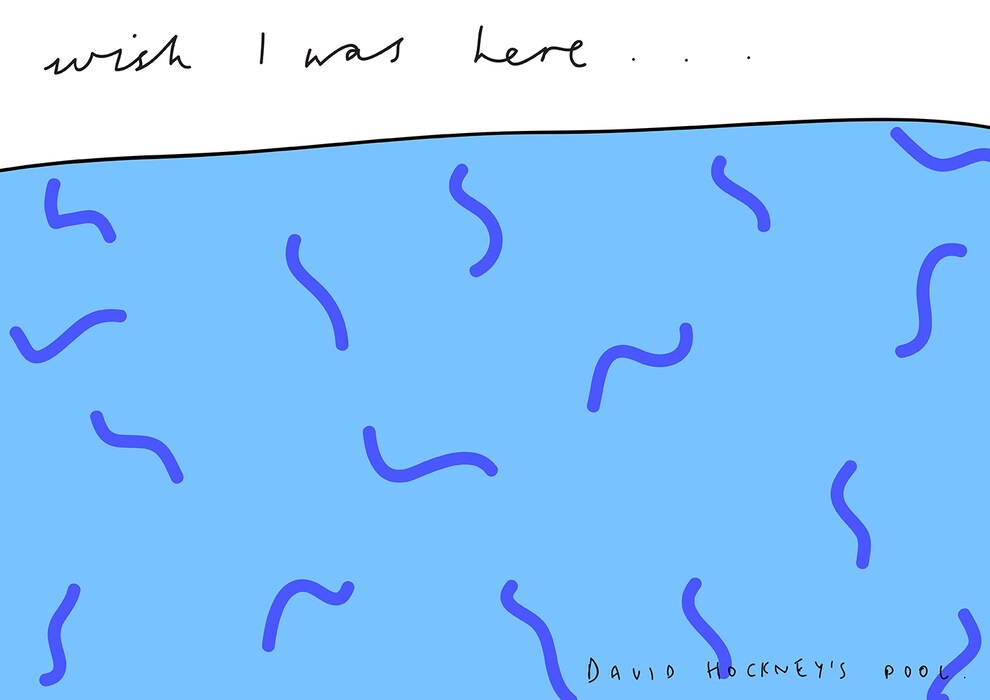 As summer ebbs away, and postcards skim through the letterbox from the smug friends and family who took their holidays later than you, we’re turning the Wish You Were Here motto on it’s head, asking illustrator Olivia Domingos to reimagine famous artist’s vistas as postcards, inscribed with the plaintive refrain Wish I Was Here.