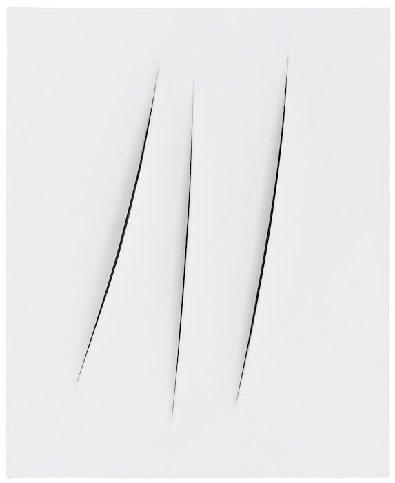 Known as the founder of the Spacialism movement, Italian painter and sculptor Lucio Fontana defined a whole aesthetic around the act of cutting. Fontana began in 1948 with the Buchi (holes) works and these physical interventions into the surface of the canvas continued with the Tagli (cuts) works in 1958, where he would cut or puncture the surface of the unprimed canvas. The style of the cuts evolved from small incisions into large, more violent slashes and he would often back the canvases with black gauze which gave the appearance of a void behind. Fontana wrote, "Art dies but is saved by gesture" and his tagli works are both gestural and violent, revealing the action of their creation as well the resulting slash. He began to make lacerations in other surfaces, such as copper and aluminium, but the cuts onto canvas are wound-like and therefore more visceral and provocative.