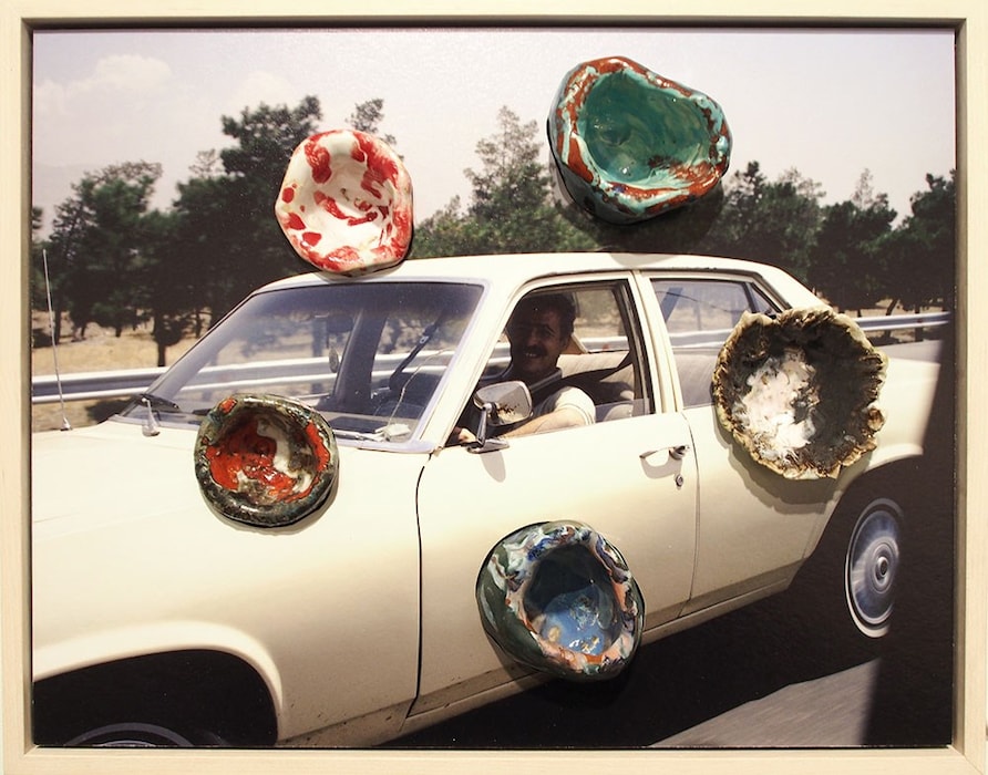That much is certain when AnOther asks Darzacq about the creative process behind his photo-sculpture hybrids, to which he quips in his thick French accent, “When I give you the cake and you like it, I won’t give you the recipe.” Luckily, the press release gives some of the secret away: sections of Darzacq’s photographs are laser-cut to insert Lüneman’s sculptural forms. From the viewpoint of a computer screen that wouldn’t necessarily be clear; the colourful ceramic shapes look as if they could have been photoshopped onto the images. In reality, Darzacq explains, the artworks appear more like “relief sculptures”, traditionally carved out of stone so that figures appear to be raised from a flat background. But his creations are hardly traditional: in Double Mix No. 45 (2015), little multi-coloured clay vessels sprout from a picture of a car, while in Double Mix No. 2 (2014), a large, speckled ceramic paint-like splodge cloaks an image of a stone statue.