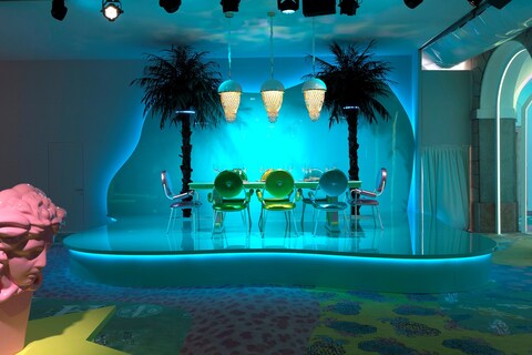 Where Versace nails kitsch opulence and Gucci rebrands chintz, Italian-American Milan-based design duo Dimore find refined glamour in both decay and hedonism. Staged inside one of Milan’s decadent but abandoned cinemas, Interstellar reminds us of the atmospheric power that can be harnessed when the creative curation of individual pieces, lighting and sound production is done right. Walking in from the crowded streets of the city visitors are plunged into a darkness that serves to allow Bowie-inspired graphic textiles and glowing metallic finishes to transport us to an intergalactic, 1970s fantasy.