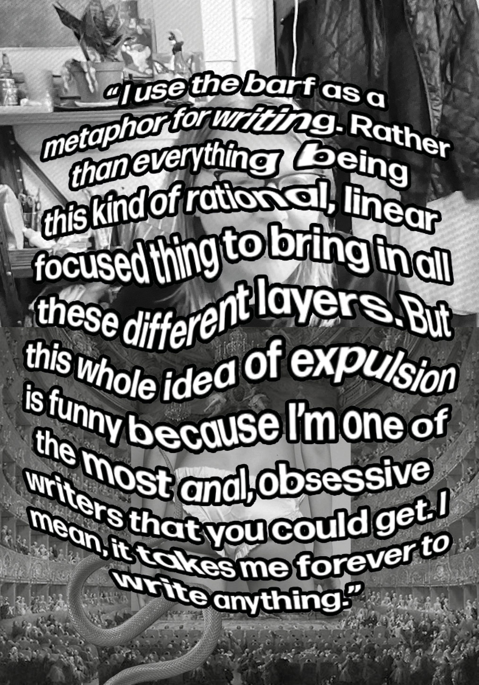 DB: I’m riffing on Eileen Myles’ piece Everyday Barf, and it ends with them on a ferry to visit their mother. There’s a lot about mortality in it. Then one person gets sick on the ferry, and then the entire ferry is throwing up. I use the barf as a metaphor for writing. Rather than everything being this kind of rational, linear focused thing to bring in all these different layers. But this whole idea of expulsion is funny because I’m one of the most anal, obsessive writers that you could get. I mean, it takes me forever to write anything. In my own work I bring all that in, on the surface I’m trying to make it look less controlled.