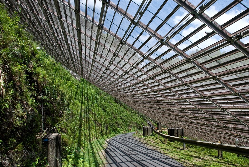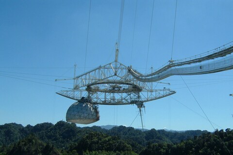 Contrasting with the vast, green forest that surrounds it, the Arecibo Observatory is among the largest and most spectacular scientific instruments on the planet. A thousand feet across and 167 feet deep, its dish is made up of nearly 40,000 now-faded aluminium panels, strung across a mesh of steel cables. Delicately suspended nearly 500 feet above is a complex 900-ton triangular platform housing some very sci-fi looking instruments, supported by cables strung from reinforced concrete towers around the rim. The entire complex looks out over the dense jungles and craggy karst peaks of western Puerto Rico, a land of subtropical wet and moist karst forests protected as the nearby Río Abajo State Forest.