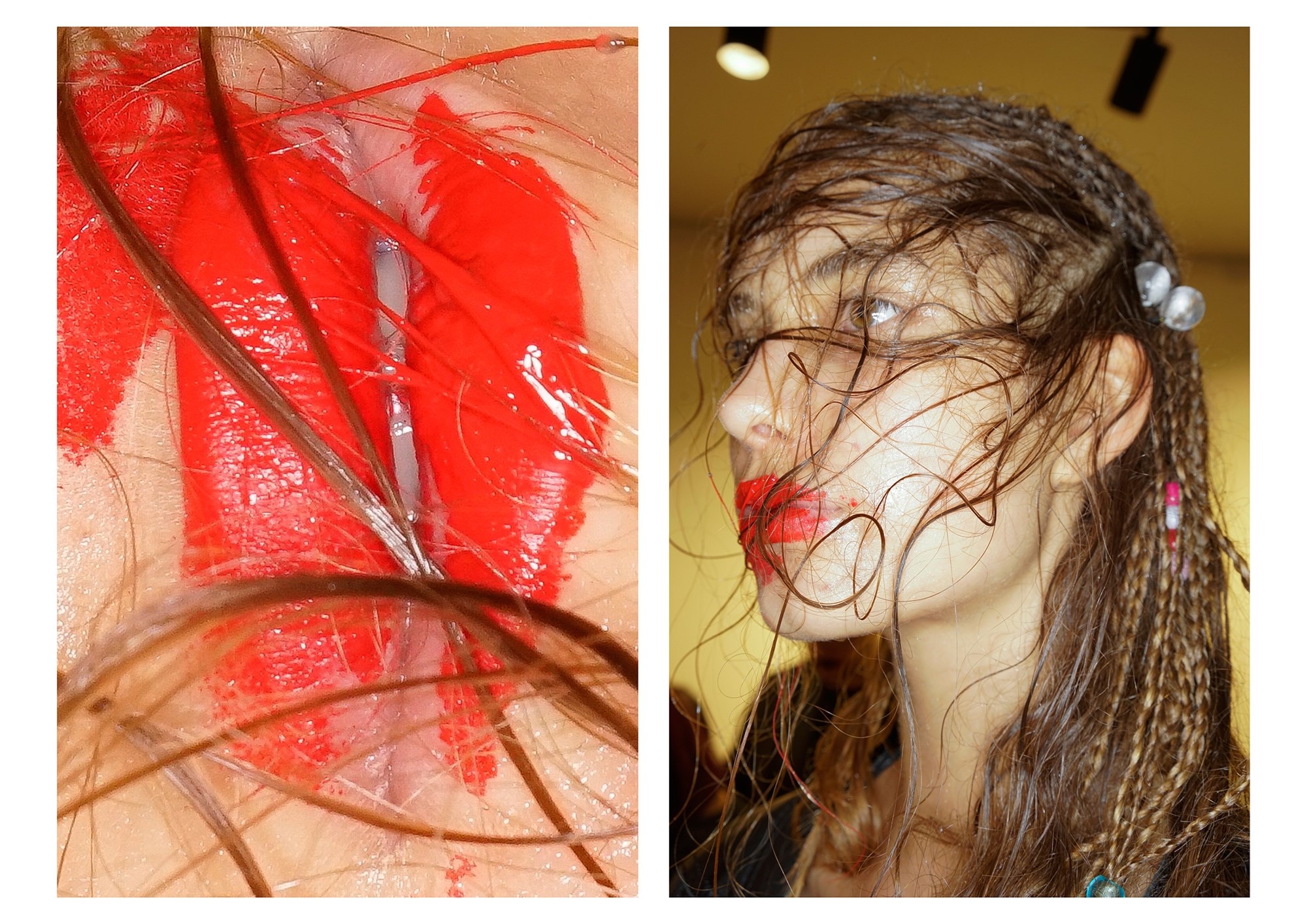 Though this is a time for creativity, it’s also a time for serious technical expertise, as MAC Cosmetics’ senior artist Dominic Skinner explains while they work. Having taken cues from Kronthaler and Westwood – as with most Westwood shows they are looking for tribes of girls and boys, with a mix of several distinct looks and this time with a painterly feel – Garland and McKnight experiment while Dominic ploughs through the MAC kit and back catalogue to find the perfect product for the job. “My job is to listen to what she wants and then figure out what to use and how to create it for the day so that she and the team can just get on and do the make-up and we have everything they need. For this water look, I now need to figure out what is going to stick to that, and look right,” Skinner explains. It’s not long before I see his assistant pouring water over colour swatches on his arms, as lurid orange goo drips all over the floor.