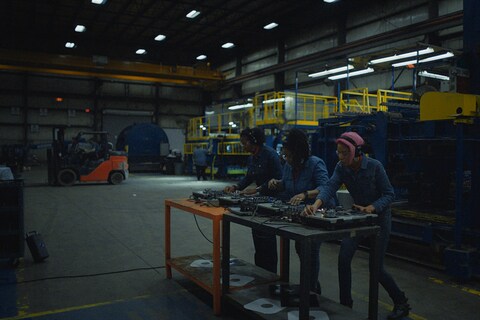 She shows this by filming three generations of legendary female techno DJs – Stacey Hotwaxx, Minx, and DJ Holographic – playing records side by side in an automobile factory, while assembly-line workers build cars behind them.