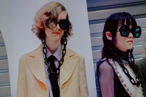 Not quite. Mid-way through, the lights dimmed to black; the sound of static and exploding lightbulbs followed. Then, out marched the collection proper, bearing the recognisable hallmarks of Michele’s previous work – the giant sunglasses, the sequins, the offbeat accessories, the 1970s-inflected tailoring. This two-act structure, Michele elaborated, was supposed to depict the before-and-after of escape – from subjugation, from society, and the norms on which it’s organised, and on towards freedom. “Fashion in any expression is an escape to freedom,” he said after the show. As if to demonstrate the point, the first look of this second act was a black gown, sheer tulle to the navel, entirely exposing the model’s bare chest beneath. It was no straitjacket.
