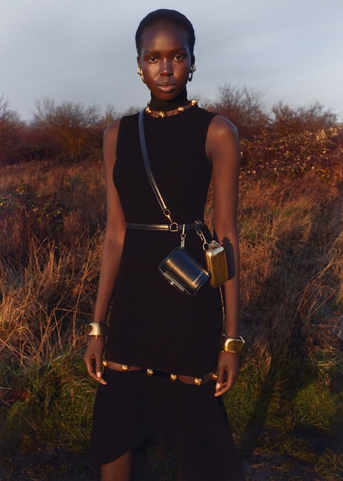 The collection itself – photographed amid the brooding English countryside – sees Burton astutely play out these juxtapositions. Severe outerwear, darted at the waist, in Donegal tweed or trompe l’oeil leather, is contrasted with cocooning Aran-knit sweaters, elongated camel-knit cardigans, and ruffled feminine silk gowns. A closing selection of looks encompass the gilded appeal of Art Nouveau – a gold moiré jacket and cigarette trousers, dresses dotted with floral sequins and gemstone cabachons, and column gowns in shades of amethyst, pink and carnelian red – while accessories riff on the “beauty of mined stones”, from colourful sculpted resin heels to pavé multi-hoop earrings, giant agate pendants and polished metal chokers.