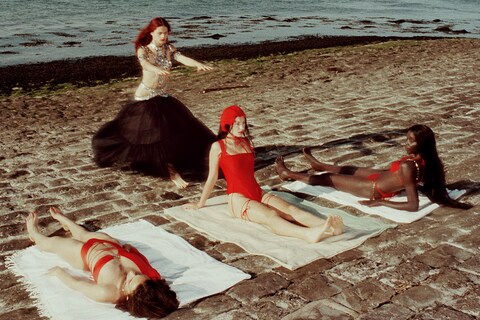 The new collection certainly bears all the hallmarks of the Dilara Findikoglu brand: gothic boning in bustier-style one-pieces that cinch in the waist and hoik up the chest; bonnets tied around the neck with a ribbon; and stockings held up by a network of crisscrossing strings that nod to the 18th-century erotic novella. (Fittingly, the campaign was shot by The Favourite director Yorgos Lanthimos on a windswept beach in Kent, which Findikoglu explains she had to watch over remotely on Zoom from Turkey). Of course, the collection also appeals to Findikoglu’s punk sensibilities, with fishnet detailing in hues of deep scarlet and one-shoulder swimsuits which have been made in a shade of azure blue that invokes the 1980s. She also nods to another of her inspirations, belly dancing, with a chains spelling out the designer’s name in block capitals attached to be bikini bottoms – a detail that can also be seen in her last runway presentation, which took place just before the first UK lockdown in February 2020.