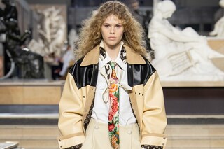 Which is perhaps why the show played out as a sequence of ‘gangs’, groups of models similarly attired, as if clad in the clothes of a subcultural clique, associating with their likes. They were typically atypical, in quintessentially Ghesquière fashion: a clutch of wide-cut pinafores, halfway between school uniform and panier skirts, crossed paths with butch, masculine-cut bombers shrugged over wide trousers. Mannish coats, wide-shouldered, were shrugged over tailored suits. A red riding jacket walked rogue. And a sequence of outfits were printed with seemingly random images by the photographer David Sims, shot in the nascent years of his career in the early 1990s, and capturing youth of that time. They seemed pinned on outfits, like pin-up shots, aspirationally tacked onto an adolescent’s bedroom wall. “They could almost be the kind of T-shirts teenagers buy on their way home from a concert,” said Ghesquière. Except, of course, they’re Louis Vuitton.