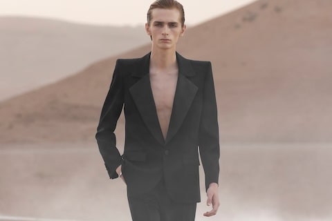 It was undeniably spectacular: in the Agafay desert at the base of the Atlas mountains just outside Marrakech, Saint Laurent defied nature and erected its own oasis, a watering-pool in a circle of light. A dust storm had, moments before, blustered through the city, making the air haze a pinkish beige that leaked out into the desert, filtering the light and making it all look a bit like a mirage. And into that already unreal terrain walked a sharp black silhouette, incongruous, a Le Smoking tuxedo tailored for the evening, kicking up sand as it strode. It was the shoulders that grabbed you – which, considering the vista of sand dunes panning out behind, is an achievement unto itself, never mind the workmanship in their realisation. The line was strong, assertive, confident.