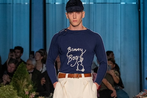This season, SS Daley took us on a literary journey of queer love and longing. With performers-cum-models reciting letters from the 1910s and 1920s between Vita Sackville-West and Violet Trefusis – queer women who defied the strict codes of patriarchal English society – Daley drew attention to the state of gender and queerness today. “In their letters, there’s a sketch of Vita and Violet arm-in-arm, walking around the south of France.” says Steven Stokey-Daley, who won this year’s LVMH Prize. “They’re all in black, Vita in a tuxedo, and it’s this moment of connection when the tone of their letters is increasingly sad, when they cannot be with one another. The emotion of that moment fills this whole collection.” Sackville-West and Trefusis regularly referenced bunnies and hares throughout their letters, which cropped up as a motif in various looks through the collection, adding to the classically English whimsy that has become the young designer’s signature.