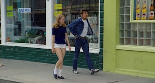 Earlier in Badlands, when the courtship of Holly and Kit still treads the terrain of innocence, the former’s circle dress, shoes and white socks recall Dorothy in The Wizard of Oz, clicking her red, glittering heels to go home. On writing this, however, I’ve realised Dorothy’s folded over ankle socks, which I always presumed to be white, are blue. As much an abstract icon as an actual item of clothing, so easily do a girl’s white socks arrange themselves in a certain corner of our psyche, that we don’t even realise when they’re the wrong colour.