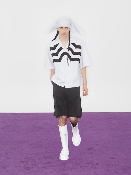 It’s this sense of disobedience, of provocation and magnetism that feeds Vattev’s S/S24 collection. Borrowing from fashion’s codes of glam rock rebellion, an MA1 bomber jacket is paired with an intricate sequined dress that’s an overt reference to Jagger’s outfit at his historic 1969 Hyde Park concert. Elsewhere, Vattev has expanded the use of his triangular jukebox closure, placed on the tailoring, outerwear and for the first time, legwear. Skintight American football pants (another reference to Jagger) offer an athletic dynamism that draws attention to the crotch, and a T-shirt is laced with string which can be drawn to reveal the bare torso beneath. Signature Georgia O’Keeffe knitwear from the previous season is transformed into a laser cut denim smock, and shorts too come geometrically laser cut, revealing a glossy, raw-hemmed lining beneath.