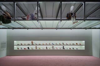 Rooms leading off this central ‘spine’ of the exhibition – literally its cerebral core, given that Prada always leads by the concept debuted in its fashion shows – are a series of rooms devoted to different themes. There are two devoted to Milano: one to Fratelli Prada, the original moniker of Prada’s flagship in the Galleria Vittorio Emanuele II, with moiré bags featuring carved clasps that formed the inspiration for the viral gurning head-clasped example on the Spring/Summer 2024 runway. The other, in monochrome, showcases what Miuccia Prada first designed when she took the helm in 1978, and invented nylon as a fabric of high fashion. Another features installations by Damien Hirst around other Prada bags, chroming them and pickling them in formaldehyde and, generally, rendering them as totems ready for worship. And the chronological aspect of the show is echoed in timelines of bags and shoes, illustrating both the profound shifts in obsessions that characterise Prada, and also the constants. The hyper-conservative top-handle bag is a silhouette repeatedly subverted; platform shoes appear again and again, framed in the signature green vitrines of Prada’s retail universe.