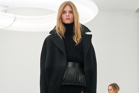 The clothes themselves reflected that fundamental simplicity of ideas, and ideals. Many were based on the circle, fabric skilfully cut to lap around the body in a seemingly continuous shape. That was a repeated motif – skeins of wool, rather than being knitted, formed loops to curtain the body, both concealing and revealing skin; denims (in wool, again) were lifted from the loom before they were entirely woven, their vertical warp threads forming fine fringes around the body, looping into a skirt. Circles, loops, curves, constantly turning back and forth. A coat was cut as two whorls, attached at cuff, hems swirling around the body. A sequence of dresses was formed on a three-dimensionally printed base, inspired by Alaïa’s figure-hugging belts and sinuous, serpentine zipper-scrolled dresses, which locked around the body with no fastenings whatsoever, fabric seeming to scroll unsuspended, leaving a flank bared.