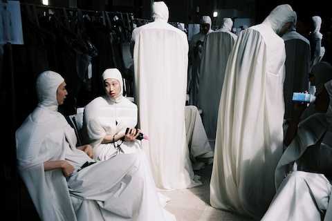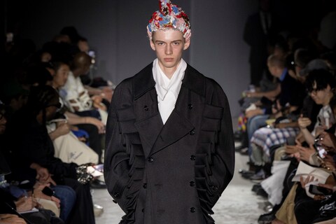 As always, Comme’s show was devoid of a big set, a flashy cast or performance – it was simply a dark room with a lit runway, and spellbinding clothes. With multicoloured headpieces made from fused-together children’s hairclips, the collection consisted mainly of monochrome, deconstructed tailoring with a more-than-occasional flash of mint green and bubblegum pink. Fabric was ruched and ruffled, or else layered with scrunched-up fabric and covered over with tulle, creating bulky, almost bloated silhouettes. As always, Rei Kawakubo didn’t give much indication of her thinking behind the collection, leaving us only with one sentence as a clue: “I want to hope for some light,” she said, “even if very small.” TS
