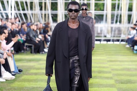 Apart from the clothes, obviously, the best thing about Jonathan Anderson’s Loewe shows is that he seems to invite the men from that TV show you’ve just binged. Be that Morgan Spector from The Gilded Age, Richard Gadd from Baby Reindeer, Leo Woodall from One Day or Kit Connor from Heartstopper. But back to the clothes – Peter Hujar’s photo of a stiletto formed the basis for this collection, which included a series of “razor looks” as Anderson himself described them, deft and exceedingly precise. Gold or monochrome feathers were fixed on the models’ heads, obscuring their faces and lending the show a surreal, and totally ethereal, beauty. TS