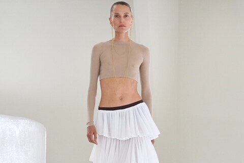 And so, that’s what we saw spiralling around the whirly-swirly peel rotunda – an exercise in simplicity, in purity and form, echoing the work of those fashion greats. Pieces were stripped to the fundamentals – circle skirts, draped hoods, capes with deep slits, bandeau tops. Present and correct was much of the spiral cutting that started the whole exchange – which echoes a famous Charles James dress, named the ‘Taxi’ (because it was as easy to get in and out of as one) and spun around the torso with a zipper, that Azzedine would riff on just as famously in the mid-1980s. And James also inspired a series of padded raw silk coats based on his famous ‘Eiderdown’ jacket of 1937, and a section in those Hudson sunset shades of taffeta inspired by that famous 1948 Cecil Beaton image of glacially chic Jamesian gowns. But Mulier sliced them into ruched sportswear separates, an idea which underpinned the whole offering – skater skirt peplums, a signature shape (“die-hard Alaïa,” in Mulier’s words) were cut atop wide, slouchy knit tracksuit trousers. “Sportswear shapes with techniques that are the opposite,” he stated. There were no buttons and no zips. And, for the ultimate in Americana, a sequence of draped evening dresses seemed to float around the body, full Barnum and Bailey magic that was actually the result of ferociously complex interior architecture. Lloyd Wright would be very happy.
