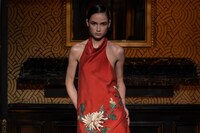 In the dimly lit art deco Beaufort Bar at the Savoy Hotel, Conner Ives put on a show harking back to the glamour of old-school salons. Models sauntered down the catwalk to Diana Ross in flamboyant caftans, bias-cut dresses and embroidered shawls, in an unabashed celebration of Americana and the sheer joy of dressing up – though his T-shirt at the end, emblazoned with the slogan “Protect the Dolls”, spoke to a deeper issue too; the plight of America’s trans community, in the wake of the Trump administration’s oppressive new policies.