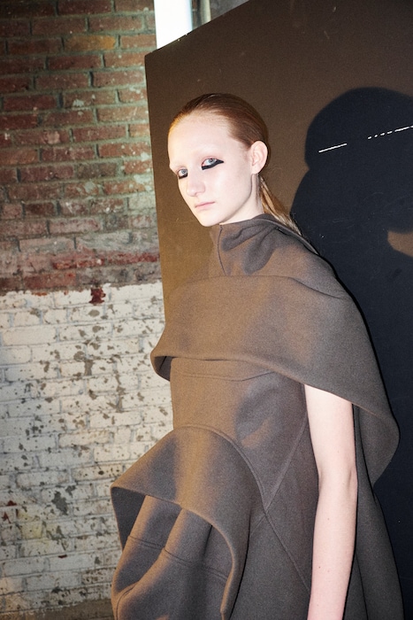 Back in AnOther Magazine S/S14, Owens told Suzannah Frankel that he had found something eerie about his then-recent trip to Dubai. "It's like Star Wars," he explained, "ancient and futuristic at the same time. And then everything has gold slapped on it. For us, what could be weirder?" And it was this same weird dichotomy that marked the show; models wore draped Grecian robes in the hues we have come to expect from Owens (black, faun, warm golden browns), occasionally embellished with a futuristic twinkle. Faces were gold-leafed for a wonderfully C-3PO effect; but the foil was peeling, weathered, disintegrating. Bames' bass-heavy electronica beats soundtracked the show, overtly modern yet attuned to something timelessly human and instinctual, creating a finely-tuned combination of an arcadian past and a dystopian future.