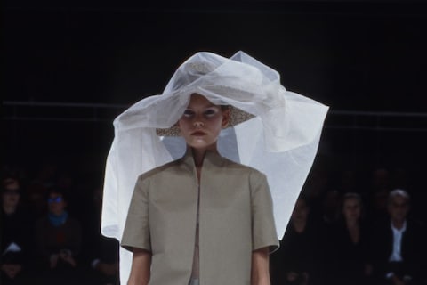 Malgosia Bela was a picture of traditionally doe-eyed bridal innocence – before she popped on the shoes, chiffon robe and hat that were concealed within the folds of her dress. Shalom Harlow (who, in the same season, was the centrepiece for Alexander McQueen’s industrial graffiti-art show), said that it was “one of my all time favourite shows... I think there was beauty and poetic sadness and laughter and humour.” Vogue’s Editor-at-Large André Leon Talley walked down the aisle to “Je T’Aime” with a stoic expression and a model who can’t help but smile.