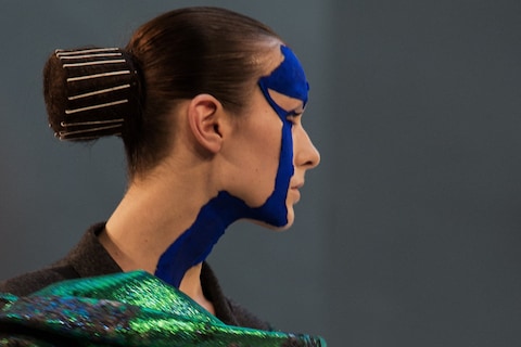 That went for the venue – a relatively anonymous salon high above the city with nothing much to it save for a raised catwalk. It also applied to the fabrication of garments. In place of the requisite chiffon and Chantilly lace came Chinese mud silks, British tweeds and tapestry canvasses. Tailoring was far from bourgeois. Instead – and in line with the early codes of both Galliano and Margiela – it was disrupted or deconstructed throughout: a puff of volume at the back of a jacket; an ankle-length coat that, in more conservative hands, would have been cut close to the torso but in this instance stood away from it looking more than a little awkward. As for the elaborate surface detail, that is so much a part of the French haute couture tradition, that was taken apart also. Crystal embroideries and metal thread were replaced by cracked mirror cut into flowers and what the powers that be at the house described as "sheaves of wheat, ginger root and olives".