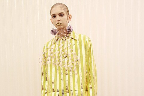 Of course, Miuccia Prada knew every finite detail and process of her latest show and collection – she was there until its ultimate completion. But perhaps where her spirit was most present was in the rebellious, chic, wrongness of it all – the sort of wrongness that only Miuccia Prada as a designer can make seem absolutely right, and right now. The figure of Tutankhamen and the 20s Egyptian revival could be found in those coats made of strips of gilded python and delicate suede, as well as in make-up artist Pat McGrath’s gold lips; the ghostly versions of 90s Prada past, made transparent in brown and orange stripes; the fabric veils draped across the models' chests, original fabrics from the 20s, unique and rare with a finite supply fully utilised for the show; the purposely plodding knits and prints layered underneath and throwing everything off… “When I was eight years old my grandmother decided to make me a sweater and asked me to choose the colours,” says Fabio Zambernardi. “I was very excited, so excited I actually could not choose… In the end I chose brown and yellow! As a kid Miuccia was also attracted to things that were so horrible and ugly, colours so wrong they become right.”