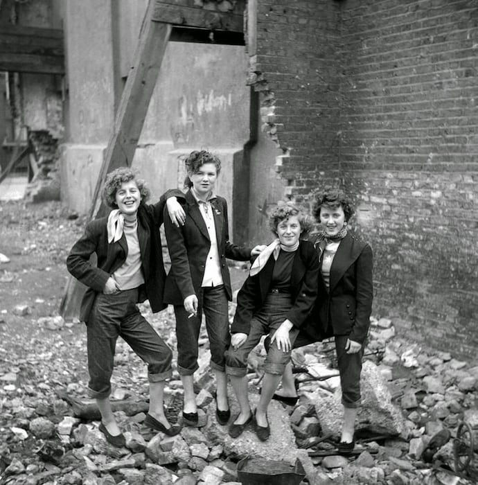 Most Teddy Girls left school at 14 or 15, taking secretarial jobs in London, or working in factories on the outskirts. Their hard-earned cash was not wasted on expensive clothes, as original London Teddy girl Mary Toovey – who, herself worked in the Kegoo factory having left school at 15 – told writer Eve Dawoud: “Turn-up jeans, a coat and something to tie around your neck, those were the Teddy Girl essentials. My friends and I would buy similar clothes when we shopped on the Portobello Road. It was all second hand then, we couldn’t afford new. Smart’s, the local pie and mash shop on Goldborne Rd, was where we went to eat out if we had the money.”