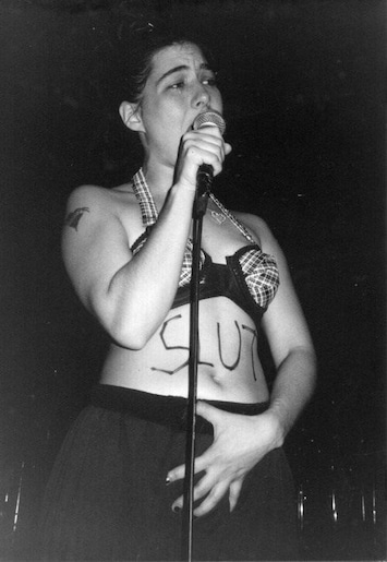 “I believe in the radical possibilities of pleasure, babe,” asserts Hanna in Bikini Kill track “I Love Fucking,” a song that muses on the gender politics and rape culture, exposing the internal conflicts between instinctive desire and an intellectual understanding of patriarchal society. If performing in a band was the best platform to shout these messages, then Hanna tapped fashion for amplification. On stage, she would often wear nothing but a bra top, with ‘Slut’ written on her torso, but this statement-making harks well back to her time as an 18-year old student, when she put together a fashion show featuring garments printed with photography and slogans. In The Punk Singer, Hanna describes an incident that happened when she was a student at Evergreen State College in 1989, where she was studying photography. Hanna’s housemate was assaulted by a man at home while Hanna was out working on silkscreens for a photography project. Hanna, vowing to “make sure this never happened again,” channelled her rage into the project she was working on. “I couldn’t keep it out,” she says. “I made a dress that said ‘As he drug her upstairs by her neck.'” The dress was the hero piece in a collection Hanna showcased at a fashion show she organised in the university’s library.