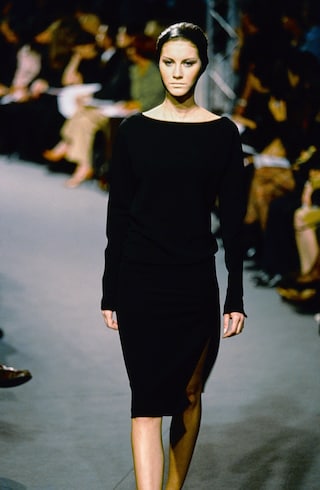 “I could see, by watching the contemporary collections and also trying to learn about fashion history, that there was a strong connection between the work of the 90s minimalists – Helmut Lang and Jil Sander – and Cristóbal Balenciaga,” Ghesquière has said of his approach at the time. What emerged on his catwalk that day was a hybrid of sleek minimalism and couture drama: 51 girls draped and cloaked in soft black jersey and sculpted leathers (bar two standout white pieces), each look was completed with a leather chin-strapped headband, redolent of those swaddling hoods that appeared in techno fabrics on Gvasalia’s Balenciaga runway for A/W17.